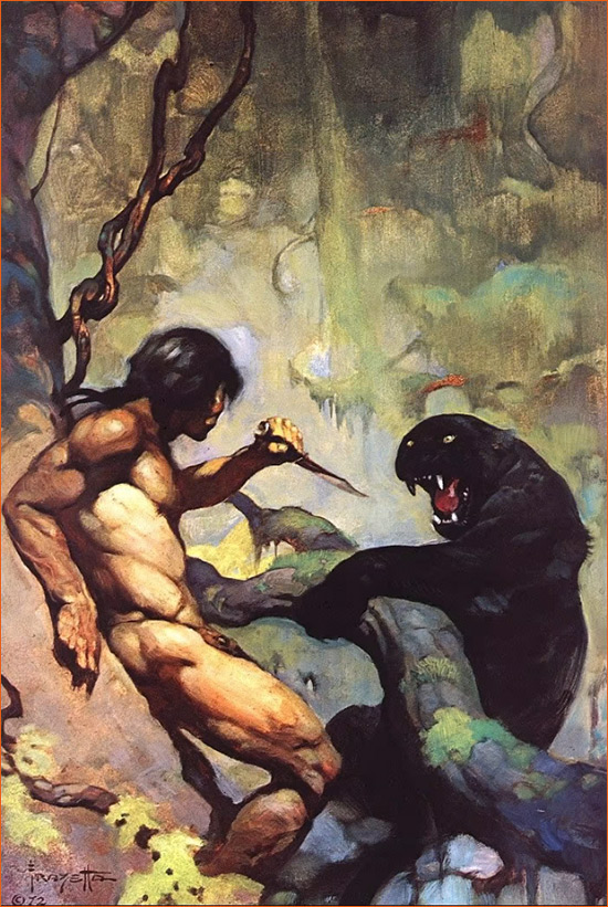 Le descriptif de l'image est un cas d'école de dynamisme en suspens. Au premier plan, une panthère noire, massive et nerveuse, s'apprête à bondir, le regard fixé sur sa proie. Face à elle, Gordon King, le protagoniste, est représenté de profil, dans une posture défensive mais courageuse, armé d'un simple poignard. Cette œuvre peut s'interpréter comme le combat éternel de l'homme face à la nature sauvage, mais aussi comme une métaphore du danger tapi dans l'ombre, une menace invisible qui finit toujours par se révéler dans la lumière crue de l'action. On y voit tout le paradoxe de Frazetta: une scène de violence imminente traitée avec une élégance et une fluidité presque chorégraphiques.
