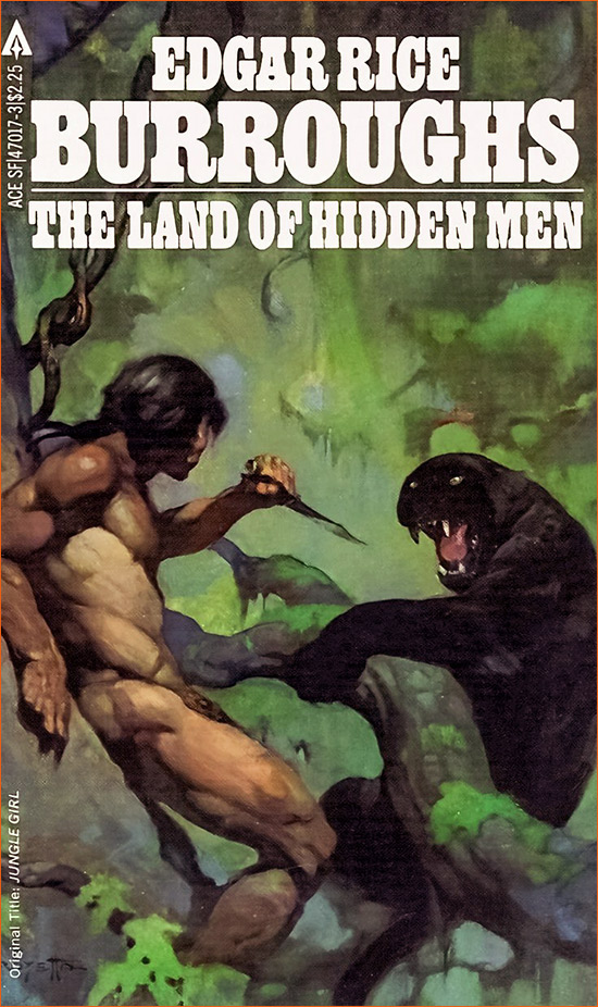 C'est en 1973 que la version la plus mémorable visuellement voit le jour chez l'éditeur Ace Books, sous le titre The Land of Hidden Men. Pour cette réédition, l'éditeur fait appel à celui qui est alors le roi incontesté de l'illustration de fantasy: Frank Frazetta. Bien que le tableau soit aujourd'hui plus connu sous le titre autonome de Black Panther, il a été conçu spécifiquement pour illustrer la rencontre entre Gordon King et les dangers de la jungle. Frazetta, avec son génie habituel, ne se contente pas d'illustrer une scène, il capture une tension primale. L'œuvre originale, une peinture à l'huile sur panneau, frappe par sa composition dynamique en diagonale, où chaque muscle bandé répond à la courbe sinueuse du félin.
