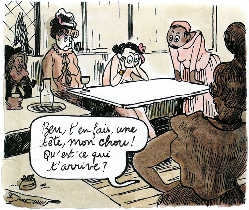 Dans Moderne Olympia (Meurisse • Futuropolis) Catherine Meurisse pastiche un tableau d'Edgar Degas, Dans un café dit aussi L'absinthe, sur une planche de sa BD. Ici, à côté d'Ellen André, on retrouve Olympia qui a pris la place de Marcellin Desboutin, et ce dernier est assis à la table voisine.