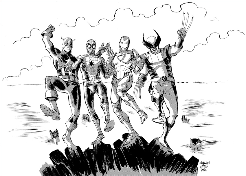 Avec l'affiche Rock & Comic-Con (Marvel) Kevin Mellon pastiche la pochette de l'album musical Destroyer de Kiss. Ici, les membres de Kiss: Paul Stanley, Peter Criss, Ace Frehley et Gene Simmons sont respectivement remplacés par Steven Grant Rogers alias Captain America, Peter Benjamin Parker alias Spider-Man, Anthony 'Tony' Edward Stark alias Iron Man et James 'Logan' Howlett alias Wolverine.