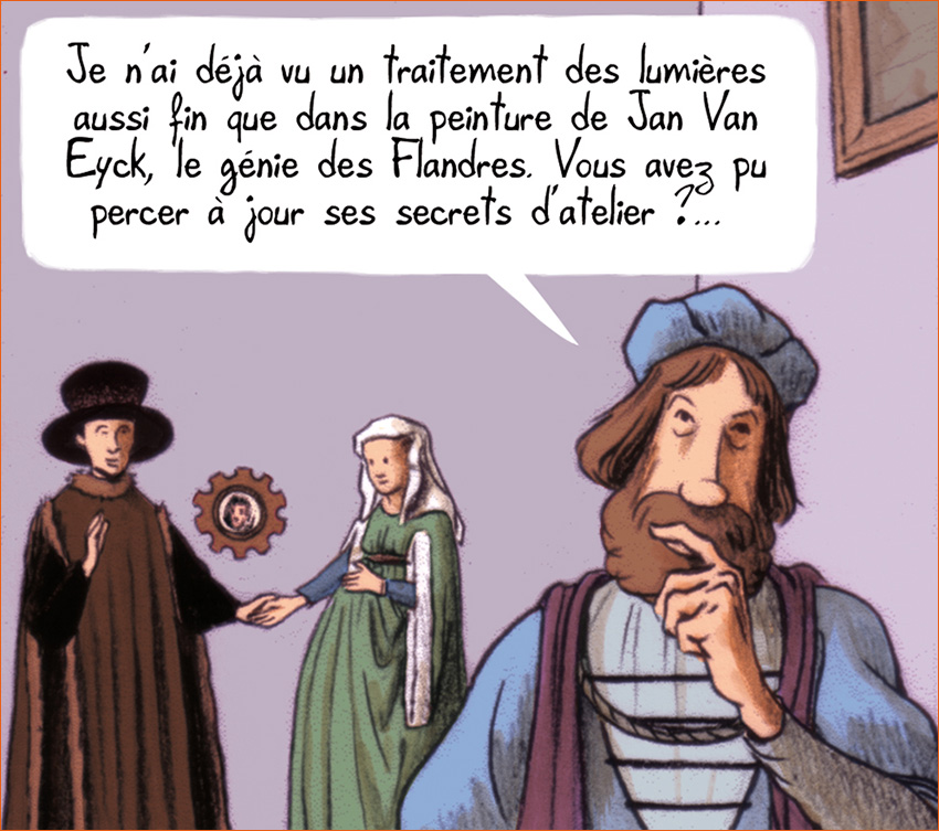Dans La vision de Bacchus (Dytar • Delcourt) Jean Dytar pastiche le tableau Les époux Arnolfini de Jan van Eyck sur une des planches de sa BD. Ici, en second plan, derrière le peintre Giovanni Bellini qui converse avec Antonello de Messine en comparant le travail de ce dernier avec celui de Jan van Eyck, on reconnaît le couple de marchands qui se tape l'incruste dans la soirée.