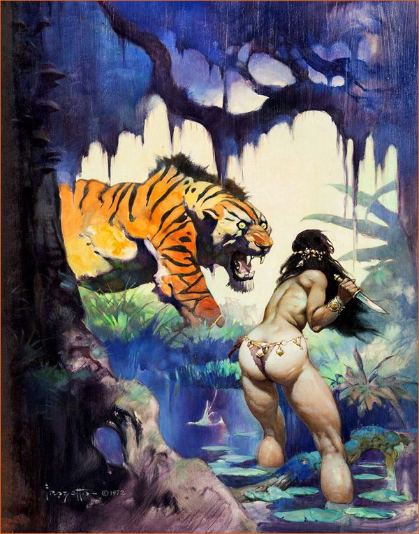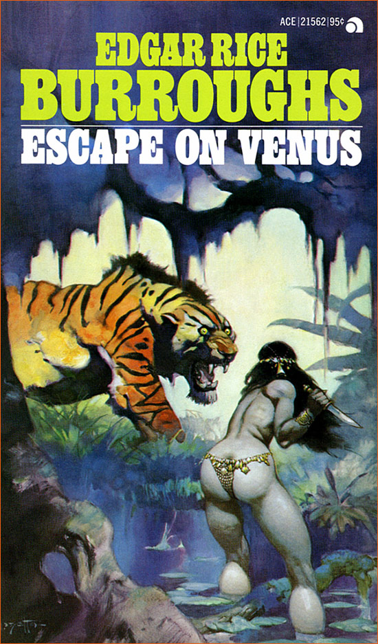 Illustration (1972) de Frank Frazetta pour la couverture d'Escape on Venus d'Edgar Rice Burroughs (1946).