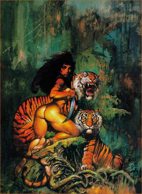 Techniquement, Frazetta est un virtuose. Il travaillait principalement à l'huile, avec une rapidité et une énergie qui transparaissent dans ses œuvres. Son style est tout sauf lisse et propret. On sent les coups de pinceau, la matière, la vie. La composition de l'artiste nous place juste derrière son héroïne, nous impliquant directement dans la scène. Elle ancre l'image sur la droite, sa posture puissante créant une diagonale qui nous mène directement au danger: le tigre qui surgit de la gauche. C'est un face-à-face classique, mais exécuté avec un dynamisme incroyable. La lumière sculpte les muscles du dos de la femme, met en valeur sa détermination et fait briller la lame de sa dague. Cette lumière contraste violemment avec la pénombre de la jungle d'où émerge la bête, dont le pelage orange vif semble presque irradier une lueur propre. La palette de couleurs est limitée, mais puissante. Des tons sombres, bleus et verts pour l'environnement, qui font ressortir la peau hâlée de la guerrière et, surtout, le rouge orangé vibrant de la fourrure du monstre. Cette touche de couleur chaude symbolise le danger mortel.