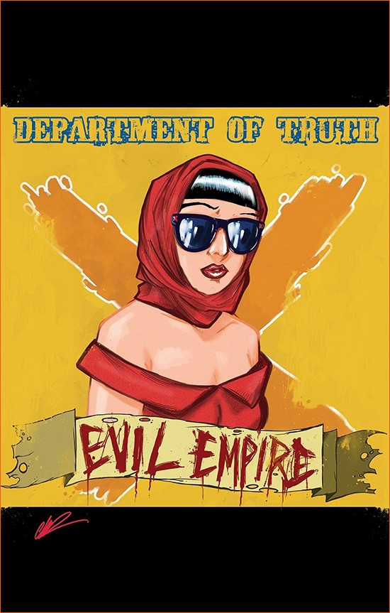 Dans le comic book The Department of Truth #14 - "Deviaton Three: Rocket Man" (Pearson et Tynion IV • Image Comics) le cover artist Chinh Potter parodie la pochette de l'album Evil Empire du groupe Rage Against the Machine sur une des couvertures alternatives de la BD. Ici, le personnage de comics Charles Chandler alias Crimebuster est remplacé par Babalon alias Scarlet Woman dit aussi "The Woman in the Red Dress".