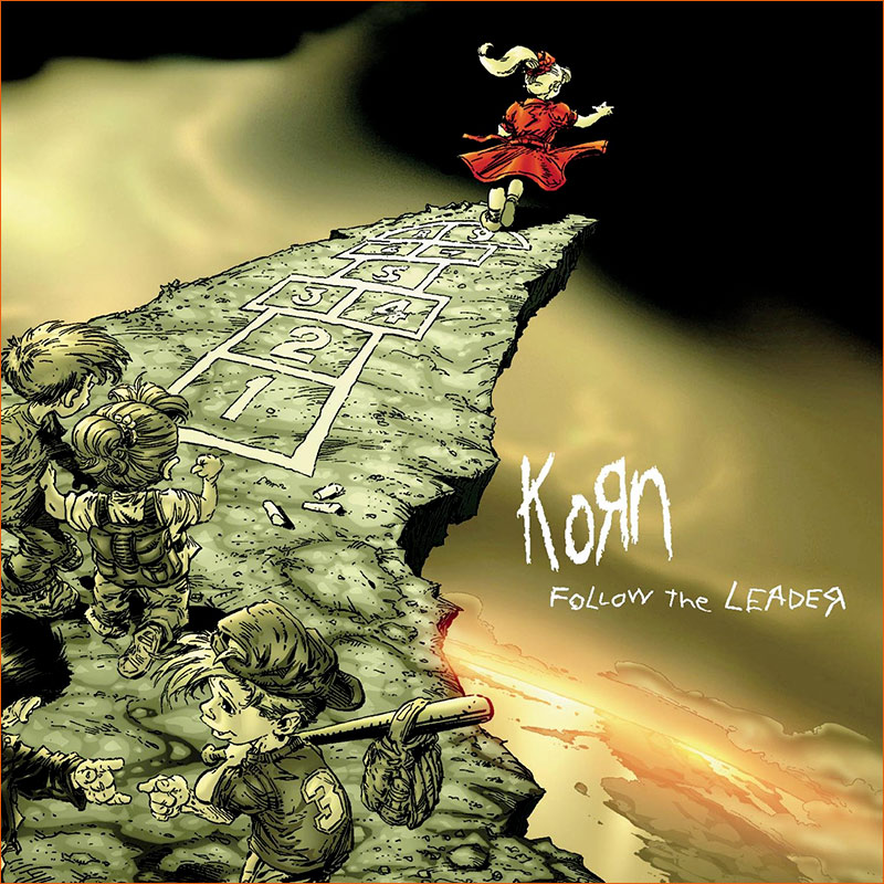 Impossible d'évoquer Follow the Leader sans s'arrêter sur sa pochette mythique signée Todd McFarlane, la légende des comics (Spawn), épaulé par Greg Capullo au dessin et Brian Haberlin à la couleur. On y voit une fillette jouer à la marelle... en direction d'un précipice, suivie d'une ribambelle d'enfants qu'on devine prêts à se jeter dans le vide. Un mélange parfait d'innocence pervertie et de malaise poétique, incarnant à merveille tout l'esprit de l'album.