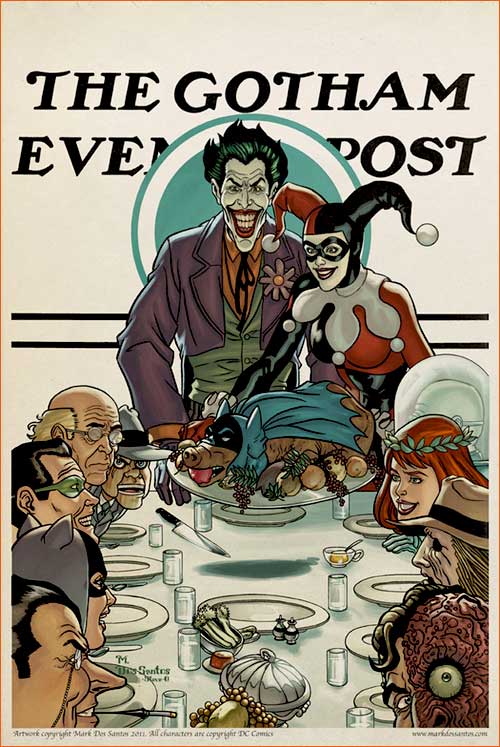 "What if Rockwell had been from Gotham City?". C'est le sujet que s'est imposé le dessinateur Mark Dos Santos dans une série d'Artwork... et l'Ex-libris - Batman (Dos Santos • DC Comics) d'aujourd'hui est une des réponses à cette interrogation. The Saturday Evening Post du 6 mars 1943, avec en Une l'illustration Freedom from want de Norman Rockwell, s'est transformé en The Gotham Evening Post. Ici, la famille modèle américaine s'apprêtant à déguster la dinde de Thanksgiving, est remplacée par les super-vilains sévissant sur Gotham City, salivant sur un porcelet à l'effigie de Batman.