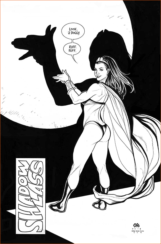 Avec l'ex-libris Shadow Lass (DC Comics) Frank Cho pastiche Shadow Artist de Norman Rockwell qui illustre la Une du magazine The Country Gentleman paru le 7 février 1920. Ici, l'ombriste est remplacé par Tasmia Mallor alias Shadow Lass.